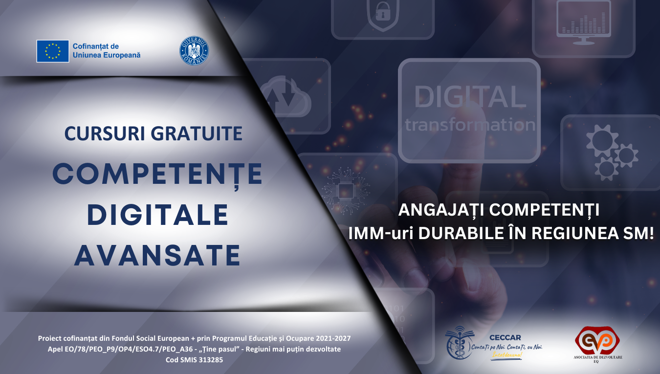 Corpul Experților Contabili și Contabililor Autorizați din România (CECCAR), în calitate de solicitant, în parteneriat cu Asociația de Dezvoltare "EQ", implementează proiectul ANGAJAȚI COMPETENȚI - IMM-uri DURABILE ÎN REGIUNEA SM!, cod Smis 313285, finanțat de Uniunea Europeană și Guvernul României din Fondul Social European +, prin Programul Educație și Ocupare 2021-2027, în cadrul apelului PEO/78/PEO_P9/OP4/ESO4.7/PEO_A36 Ține pasul, prioritatea P09 Consolidarea participării populației în procesul de învățare pe tot parcursul vieții pentru facilitarea tranzițiilor și a mobilității (ESO.4.7).