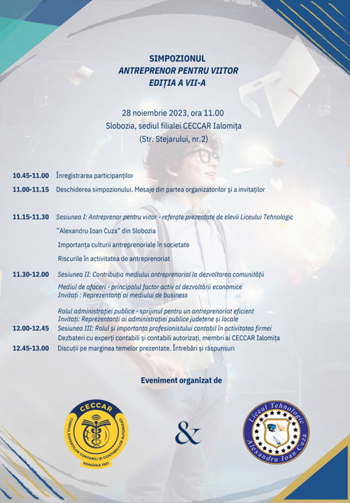 Marți, 28 noiembrie, CECCAR Ialomița va găzdui cea de-a VII-a ediție a Simpozionului cu tema „Antreprenor pentru viitor”. Evenimentul este organizat în colaborare cu Liceul Alexandru Ioan Cuza, Consiliul Județean Ialomița și Primăria Slobozia, sub umbrela parteneriatului intitulat „Formal, Nonformal și Informal în Educația Economică a Elevilor”.