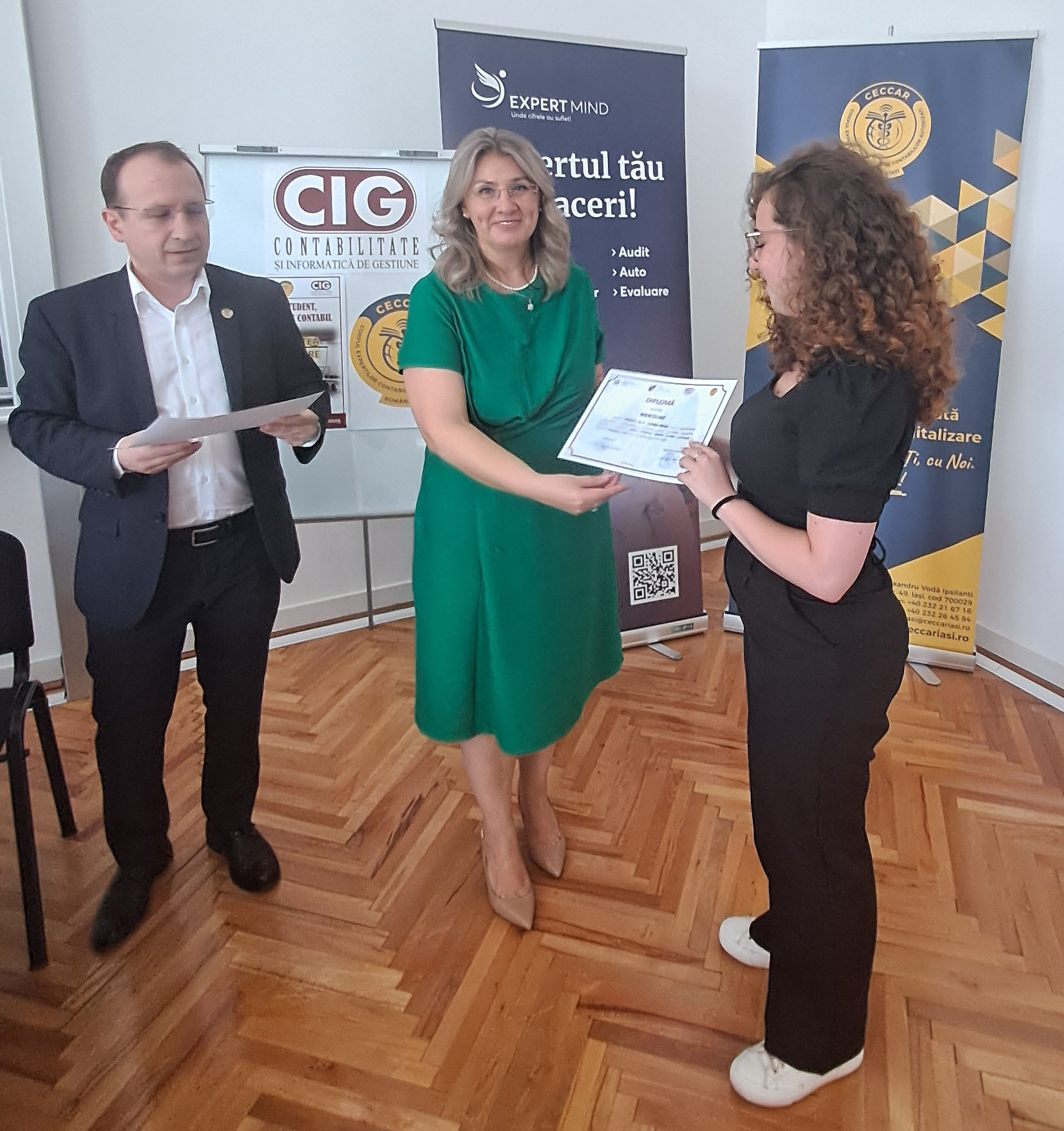 Din partea Filialei CECCAR Vaslui, Dana-Maria Morozan a adresat, de asemenea, un mesaj de încurajare: „Mi-a făcut o deosebită plăcere să fiu alături de dumneavoastră la această festivitate plină de emoții. Sunt onorată și bucuroasă că am contribuit și mi-am revăzut dascălii atât de dragi mie. Vă mărturisesc că am simțit o mare bucurie că împreună să inspirăm noile generații și să ne lăsăm la rândul nostru inspirați de ei. Felicitări studenților, am încredere în voi, am văzut în fiecare speranța către un viitor luminos și prosper!”.