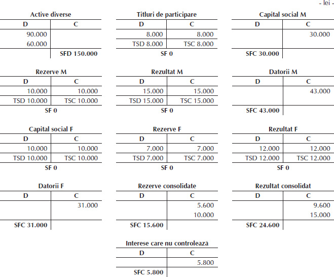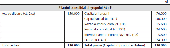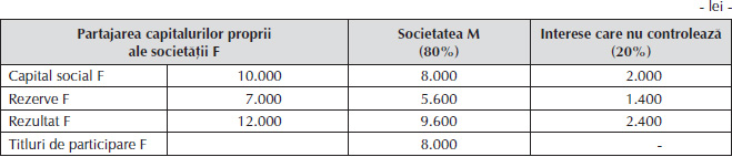 | 29.000 lei 10.000 lei 7.000 lei 12.000 lei | % 101.F „Capital” F 106.F „Rezerve” F 121.F „Profit sau pierdere” F | = | % 106 „Rezerve” consolidate 121 „Profit sau pierdere” consolidat 108 „Interese care nu controlează” 261 „Acțiuni deținute la entitățile afiliate” | 29.000 lei 5.600 lei 9.600 lei 5.800 lei 8.000 lei |