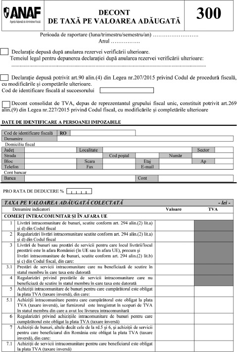 Pentru a crea suportul declarativ pentru prestatorii de servicii de telecomunicații, de radiodifuziune și televiziune sau servicii furnizate pe cale electronică, stabiliți sau care își au domiciliulstabil sau reședința obișnuită în România, care prestează astfel de servicii către persoane neimpozabile din alte state membre, a căror valoare nu depășește 46.337 lei, sunt inserate în formularul (300) „Decont de TVA” (formular rândurile 17 și 18 pentru declararea taxei pe valoarea adăugată aferentă prestărilor de astfel de servicii, pentru care locul prestării era în România potrivit art. 278 alin. (8) din Codul fiscal, dacă prestatorii din România nu optau pentru aplicarea regulii prevăzută la art. 278 alin. (5) lit. h) pentru stabilirea locului prestării la beneficiar.