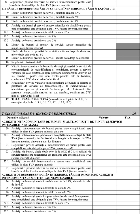 Rândul 24 - se înscriu informațiile din jurnalul de cumpărări*) privind baza de impozitare și taxa pe valoarea adăugată deductibilă aferentă achizițiilor din țară de bunuri și servicii, taxabile cu cota de 19%, altele decât cele înscrise la rd. 27, precum și baza de impozitare și taxa aferentă importurilor care nu se încadrează în prevederile art. 326 alin. (4) și (5) din Codul fiscal, pentru care exigibilitatea intervine în perioada de raportare.