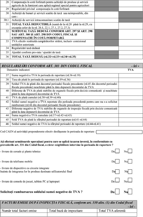 În aceste condiții, este necesară completarea instrucțiunilor de completare ale rândurilor dedicate Taxei pe valoarea adăugată deductibilă – Achiziții de bunuri/servicii în interiorul țării și importuri, achiziții intracomunitare scutite sau neimpozabile, respectiv rândurile 24, 25 și 26 din decont,dedicate operațiunilor taxabile, cu instrucțiuni privind completarea, de către persoanele impozabile nestabilite în România, care sunt beneficiare ale regimului special non-UE, a informațiilor privind baza de impozitare și taxa aferentă activităților sale impozabile supuse acestui regim.
