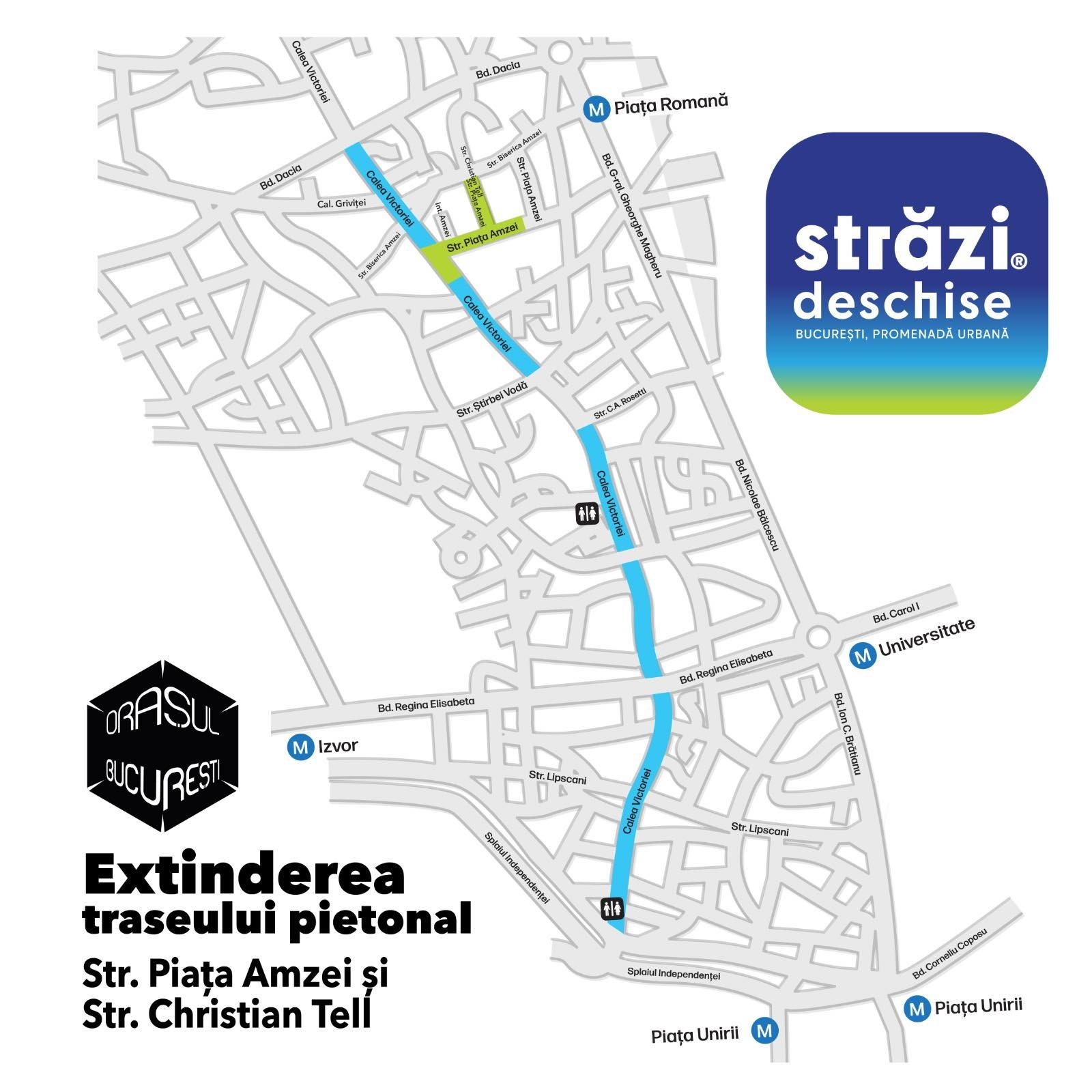 Începând din weekendul 5-6 iulie, traseul pietonal „Străzi deschise – București” se lărgește cu două noi artere: strada Piața Amzei (între Calea Victoriei și Piața Amzei) și strada Christian Tell (între str. Biserica Amzei și str. Piața Amzei) devin pietonale pe toată durata proiectului, până în luna octombrie, oferind bucureștenilor mai mult spațiu pentru plimbare în inima orașului.